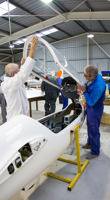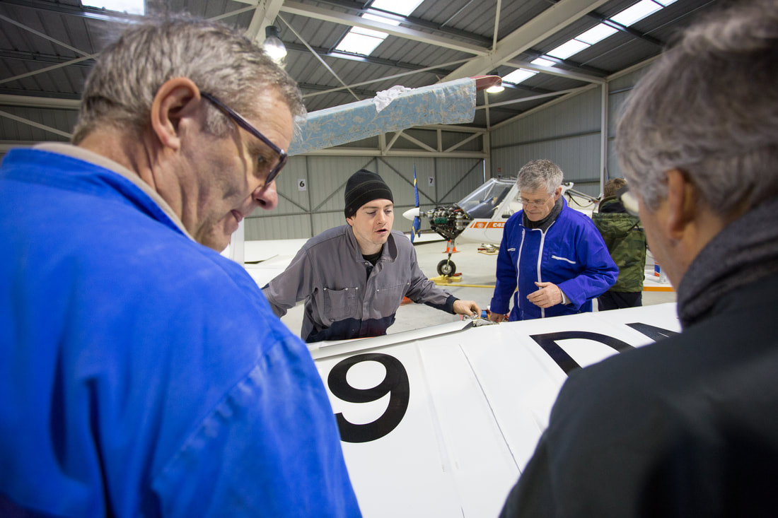 L’hiver est l’occasion de vérifier et réparer le matériel du club.Les ailes sont polishées.L’inspection visuelle nécessite de savoir où regarder et de savoir ce que l’on recherche (une crique, un décollement, de la corrosion.)Chaque appareil dispose d’un responsable machine qui s’entoure d’une équipe pour mener à bien l’entretien.Les ailes et les fuselages sont nettoyés…Yves réalise ici une retouche sur une verrière.Chaque séance est l’occasion d’un partage de connaissances et d’expériences.Notre hangar durant l’hiver 2017.Les entretiens nécessitent le démontage et la vérification d’éléments mécaniques et d’instruments de bord.Notre ULM remorqueur est également au planning d’entretien.Chaque opération est consignée dans les plans d’entretien.En 2017, en plus des travaux sur les machines, un gros travail est également réalisé pour aménager le club-house.